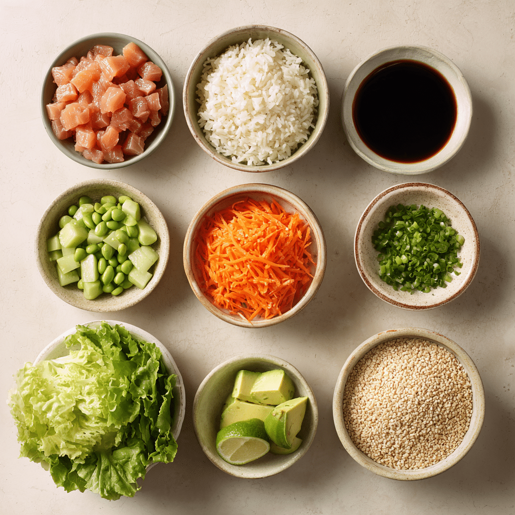 - Sushi-grade Tuna or Salmon: 200 grams, diced – the heart of the bowl, tender and rich.
