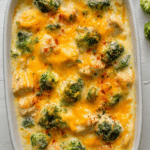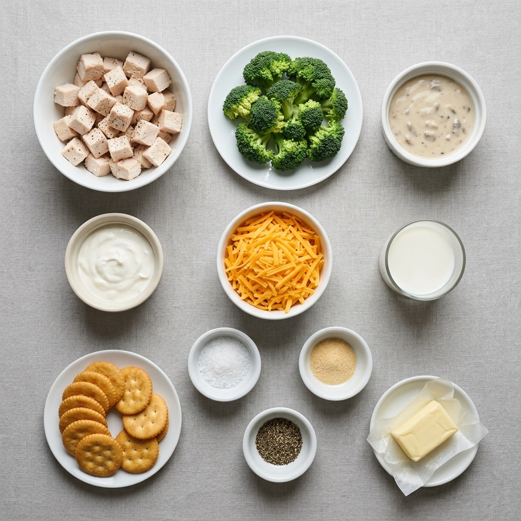A comforting baked casserole made with tender chicken, steamed broccoli, creamy mushroom sauce, melty cheddar cheese, and a buttery crushed cracker topping baked until golden and crisp.