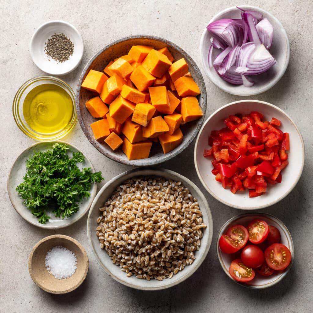 A vibrant, hearty salad made with roasted sweet potatoes, bell peppers, cherry tomatoes, red onion, and chewy farro, all tossed with fresh herbs and a lemon-garlic dressing. Perfect for meal prep or a nourishing side.