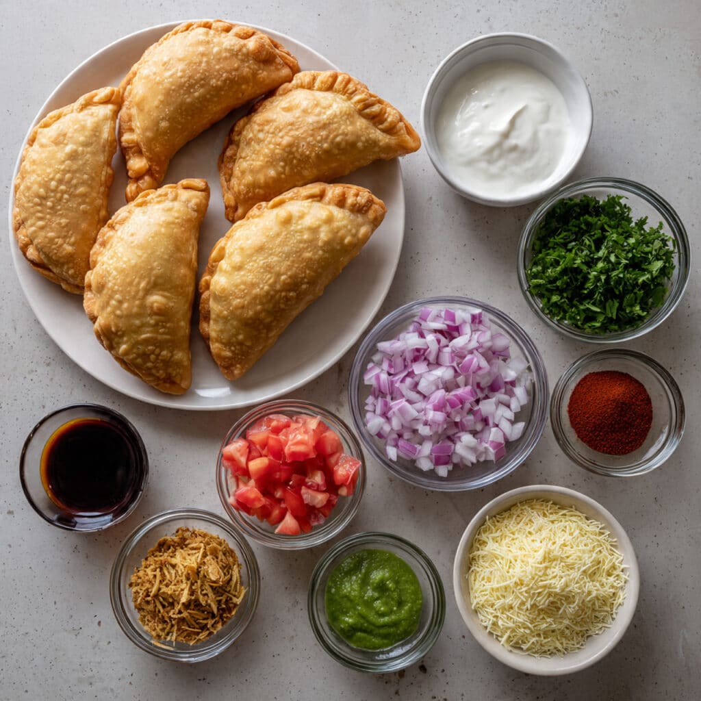 A vibrant Indian street food favorite made with crispy samosas layered with creamy yogurt, sweet tamarind chutney, fresh green chutney, crunchy sev, and aromatic spices for the ultimate balance of flavor and texture.