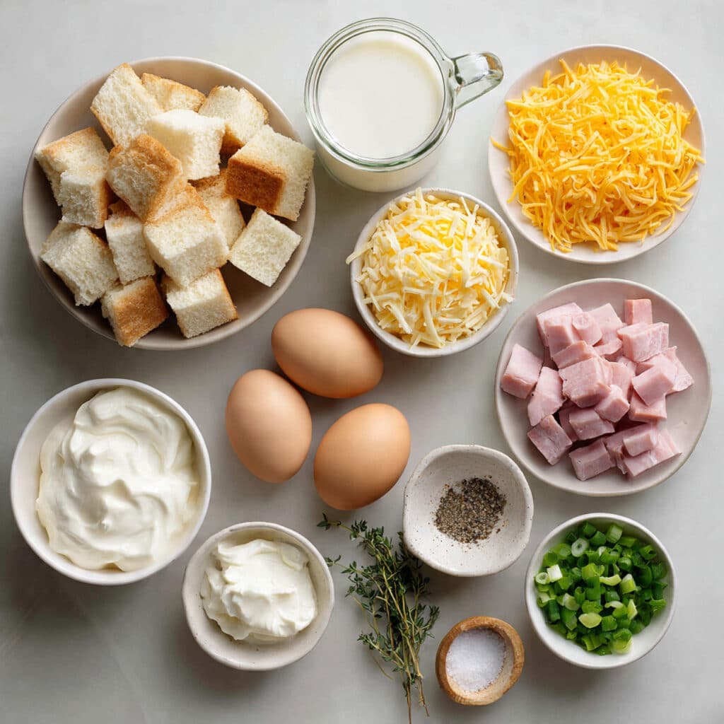 This dish is all about contrasts: the crispy, golden top, the soft, custardy center, and the gooey, cheesy bites tucked inside. The bread edges get crunchy while the middle stays soft and rich. The herbs brighten everything up, and the ham adds savory depth to every forkful.