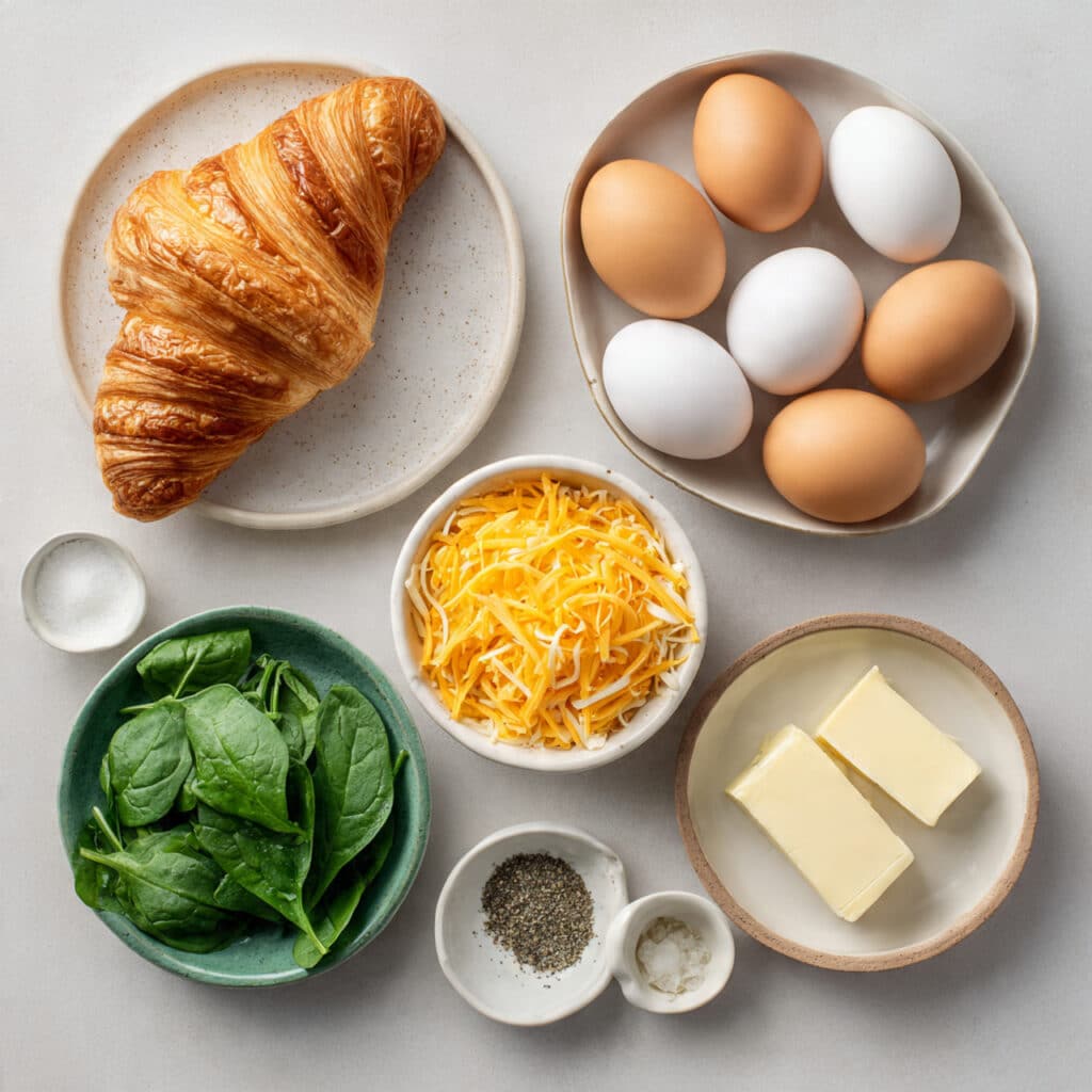 - Assemble the Dish: Pour eggs into the skillet, place the croissant cut side down into the eggs, and sprinkle cheese and spinach over the eggs.
