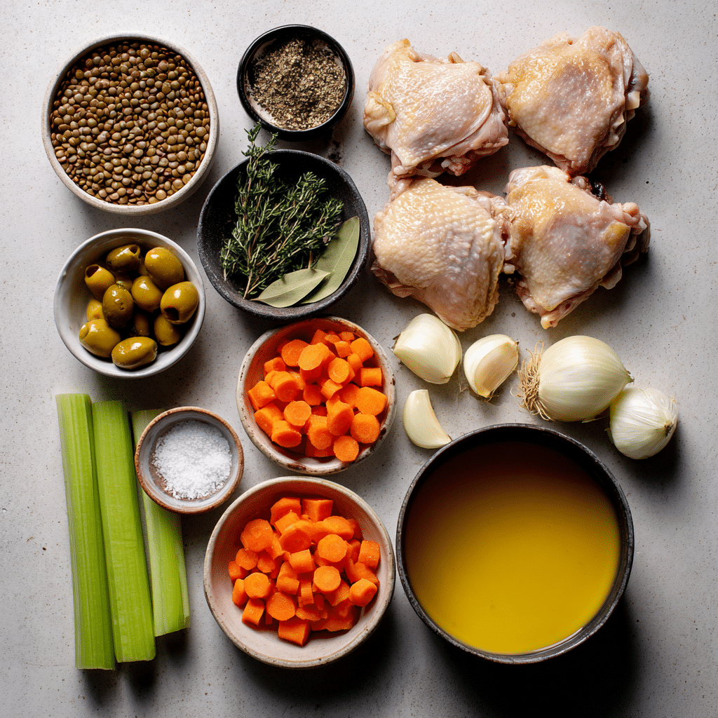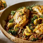 A cozy and flavorful one-pan dish combining golden chicken thighs, earthy lentils, briny olives, and zesty lemon for the ultimate comfort meal.
