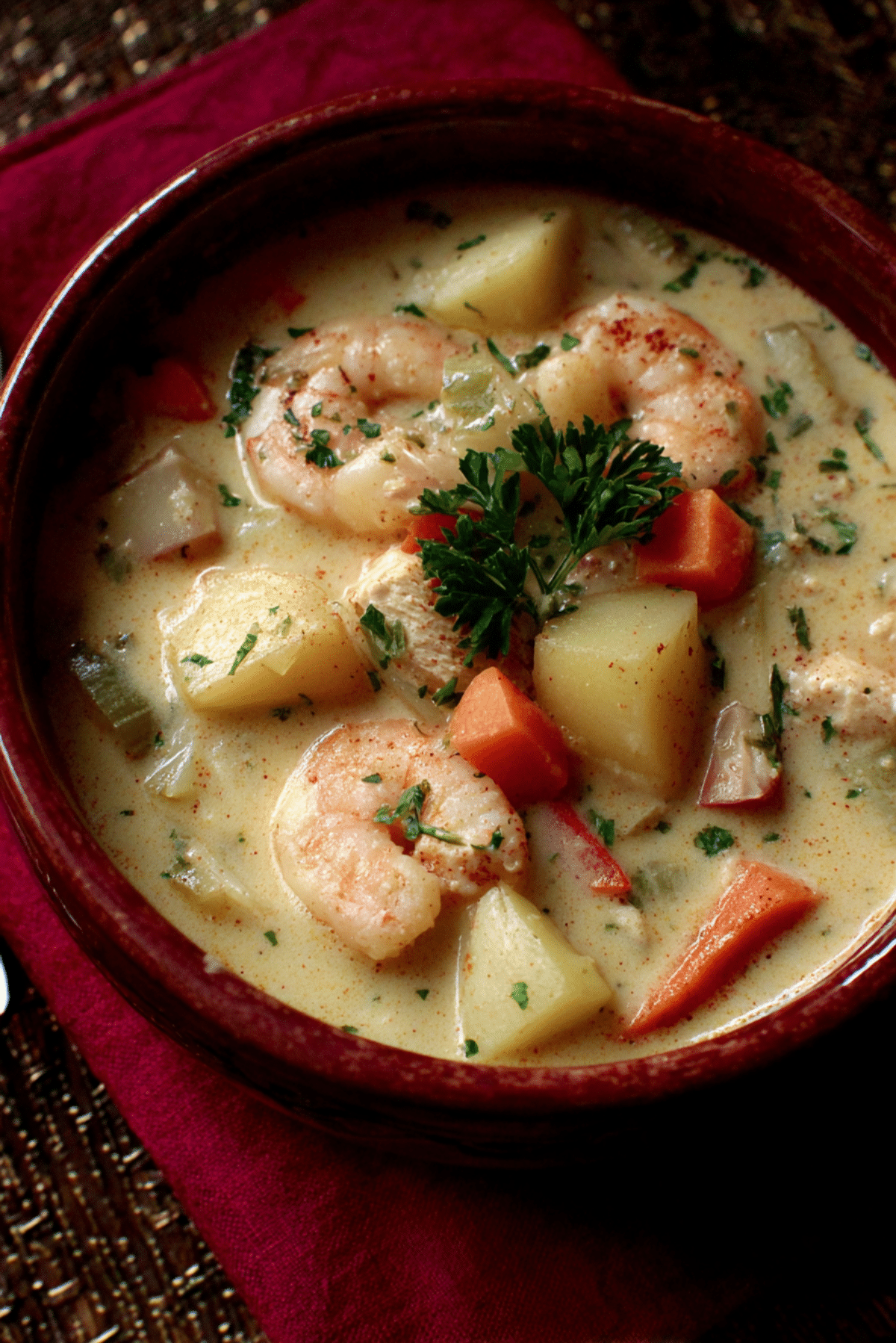 Chowder has its roots in fishing communities. Traditions tell of fishermen and coastal cooks using fresh catch, potatoes, cream or milk—and sometimes bacon or pork fat—to create hearty soups thickened into chowders. :contentReference[oaicite:0]{index=0} This version leans into that legacy but brings in mixed seafood for extra depth.