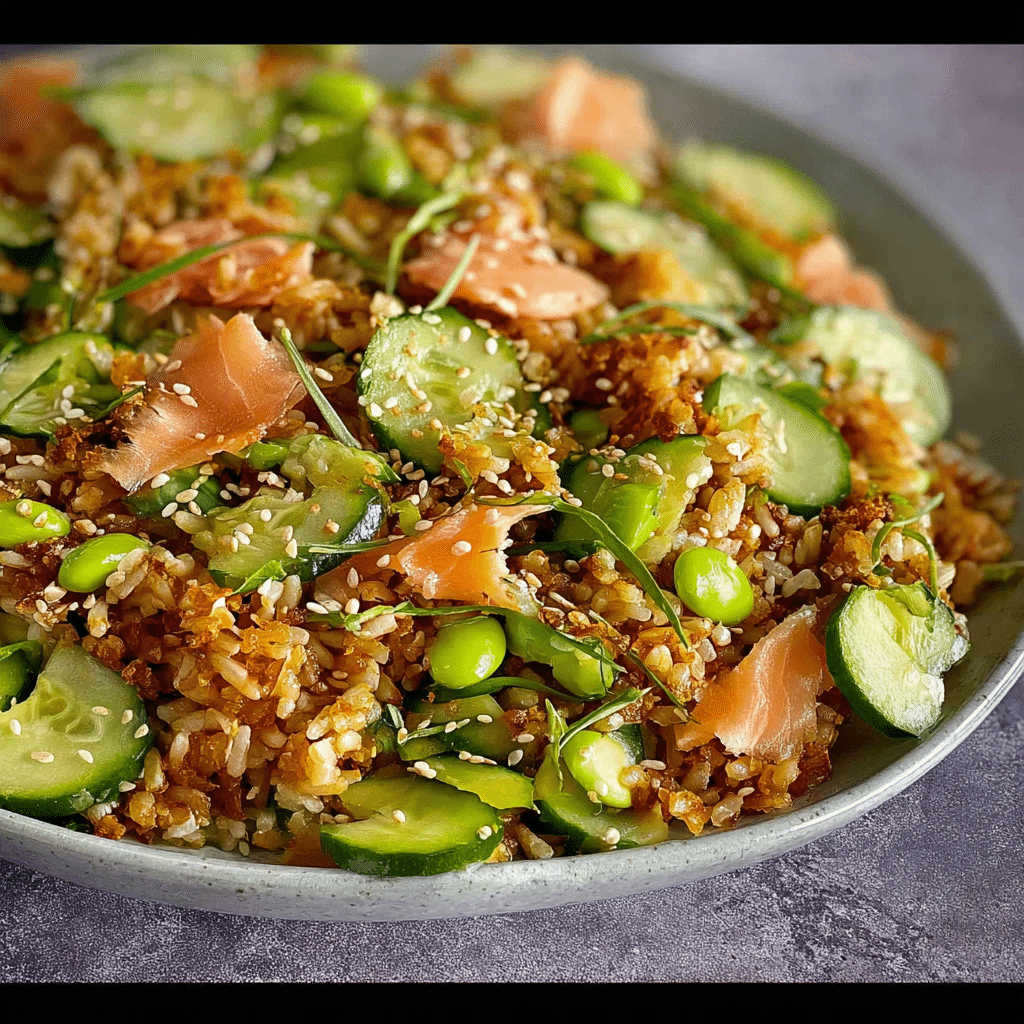 A refreshing and elegant salad featuring smoky salmon, golden crispy rice, and fresh vegetables tossed in a citrus-soy dressing. Perfect for a light lunch, dinner party, or creative way to use leftover rice.