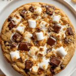 A thick and gooey S’mores Cookie packed with melted milk chocolate, soft marshmallows, and crunchy graham cracker pieces, baked to golden perfection with crisp edges and a chewy center.