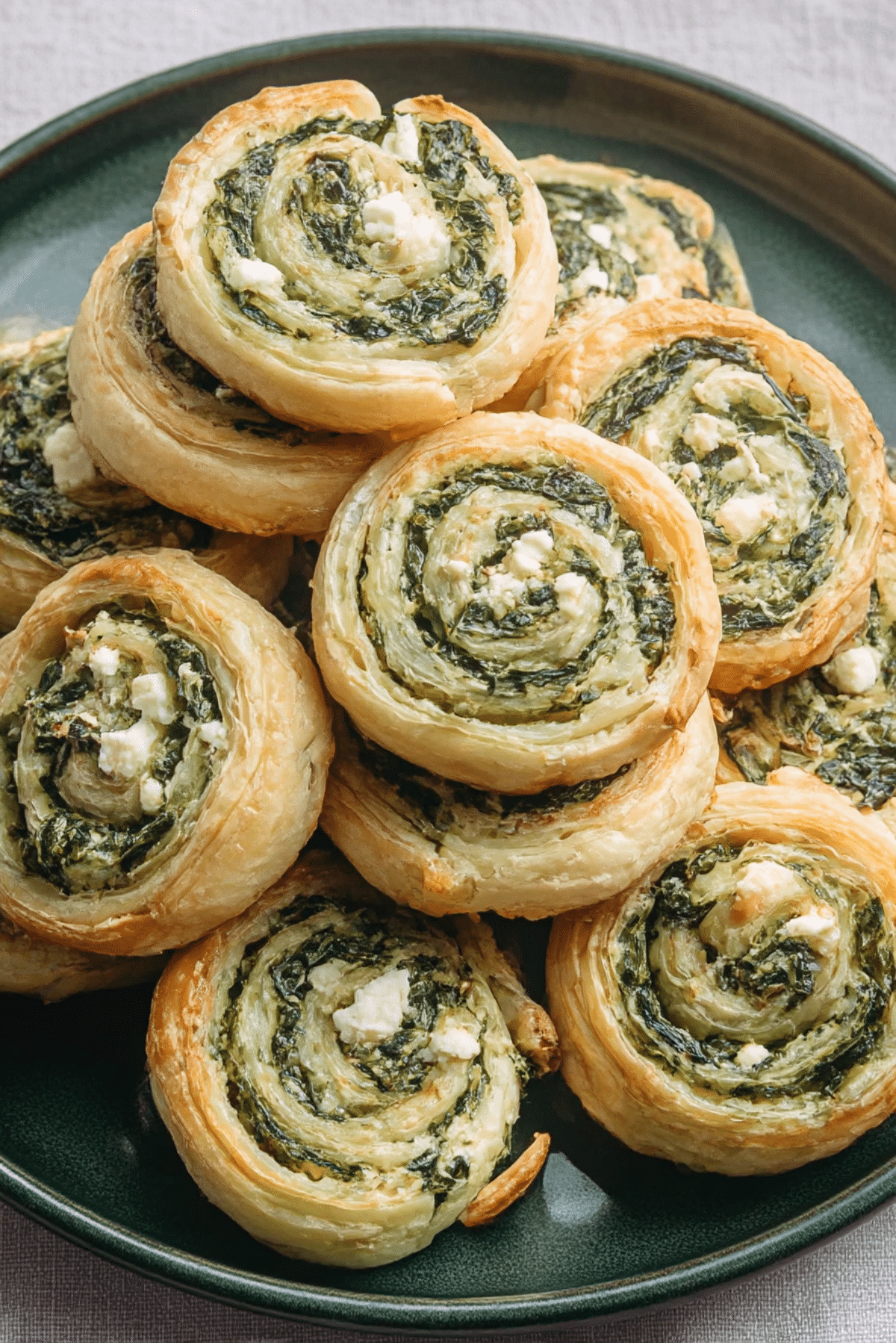 Golden, flaky Spinach and Feta Pinwheels filled with creamy cheese and garlicky spinach. These easy-to-make spirals are perfect for brunch, snacking, or party platters.