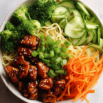 Sesame chicken has roots in Chinese American cuisine, where bold sauces and quick stir frying create dishes that are both comforting and vibrant. Noodle bowls like this have become popular all over the world because they are adaptable and easy to personalize. This version brings together classic sesame flavors with a modern bowl style presentation, making it perfect for busy weeknights or relaxed weekend dinners.