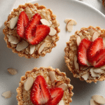 Golden oat and almond cups topped with fresh strawberries and sliced almonds, lightly sweetened with honey and baked until perfectly crisp on the edges and tender in the center.