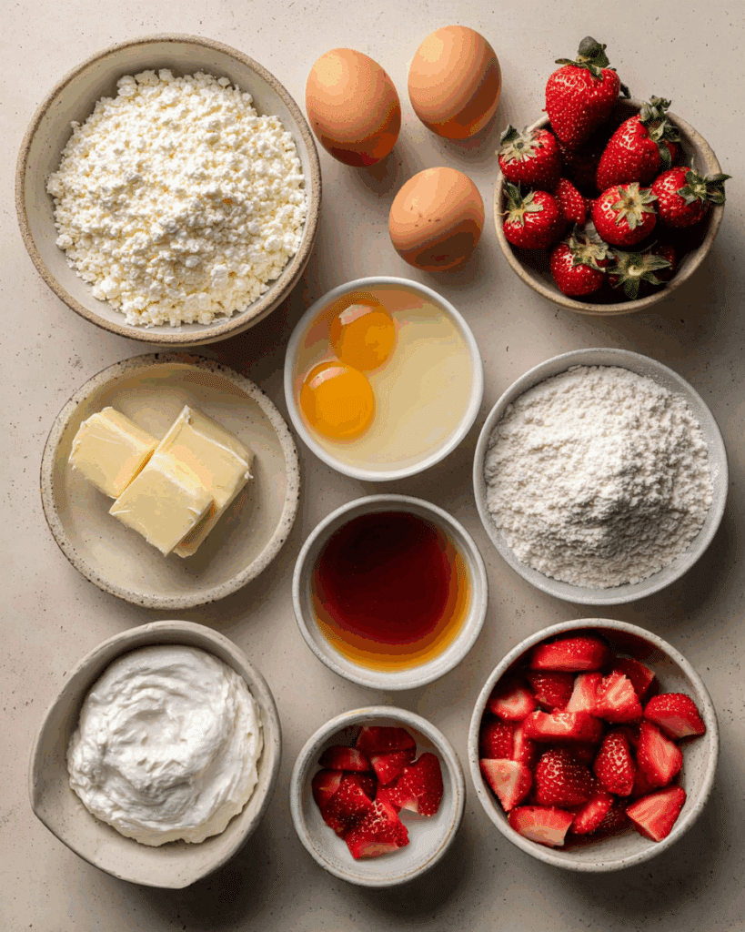 - Prepare the Batter: In a mixing bowl, combine cottage cheese, eggs, vanilla extract, and milk. Stir to combine. Add the flour, baking powder, and salt, then mix until smooth. Gently fold in the diced strawberries.