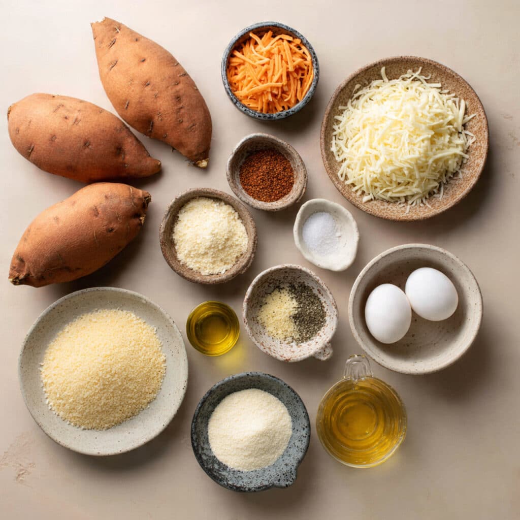 There is something magical about taking humble sweet potatoes and turning them into little golden bites of comfort. The moment they come out of the oven, crisp on the outside and soft and cheesy on the inside, the whole kitchen smells warm and cozy. Trust me, you are going to love this. These little bites are crispy, slightly sweet, perfectly savory, and honestly hard to stop eating once you start.