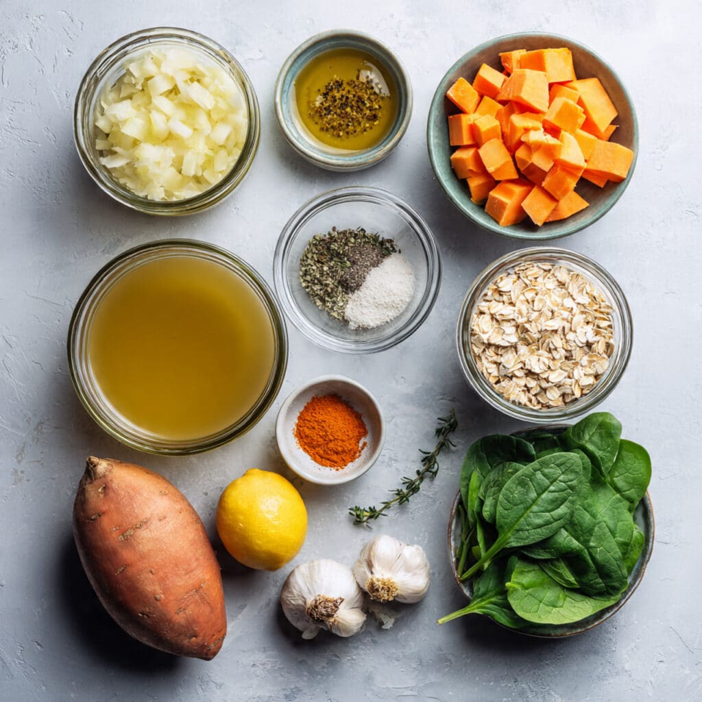 The texture here is everything. You get creamy thickness from the oats, tender bites of sweet potato, and leafy spinach that adds a light chew. The flavor builds in layers first from the garlic and onion, then the sweet potatoes, and finally the herbs and lemon which lift it all up.