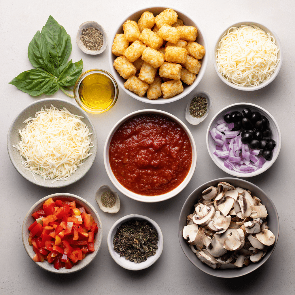 - Tater Tots: 1 (32-ounce) bag, frozen forms a crisp, golden crust that replaces traditional pizza dough.