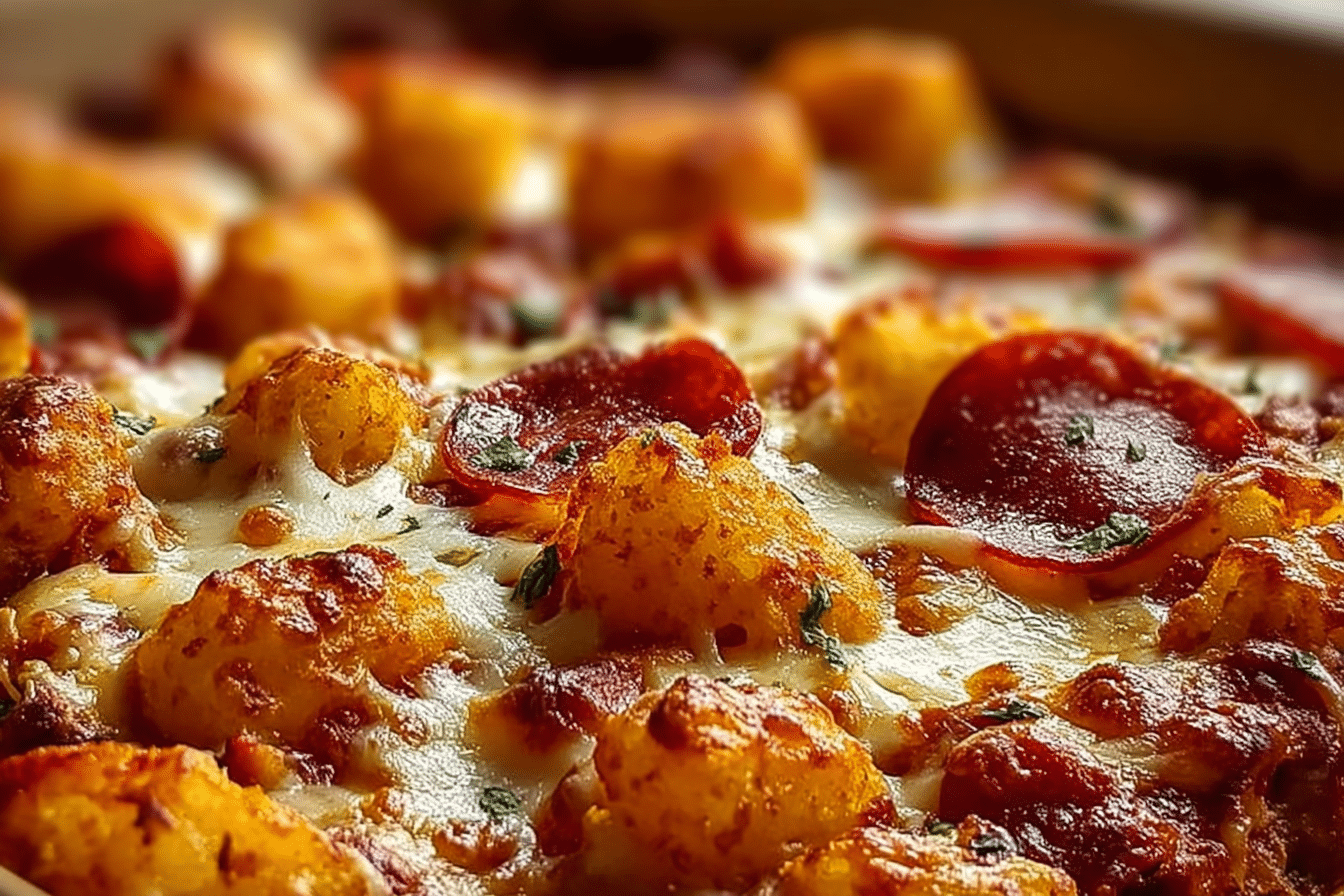 A cozy, family-friendly bake that layers herby pizza sauce, gooey mozzarella, colorful veggies, and a crown of crispy golden tater tots for the ultimate cheesy, saucy, crunchy comfort dish.