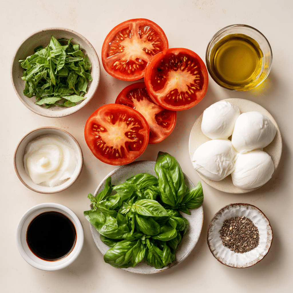 Ingredients in Tomato, Burrata, and Basil Salad Stack
