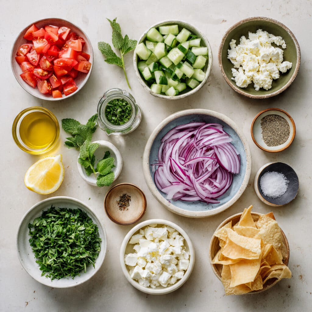 - In a large bowl, combine the chopped tomatoes, cucumbers, red onion, parsley, mint, and crumbled feta.