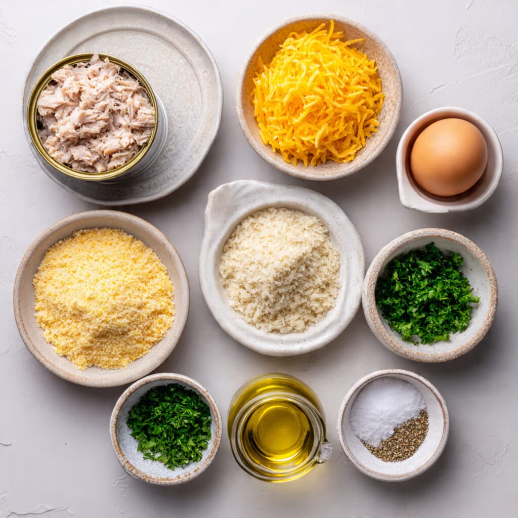 - In a large bowl, combine the drained tuna, shredded cheese, breadcrumbs, chopped onion, parsley, garlic powder, salt, pepper, and egg. Mix gently until just combined.