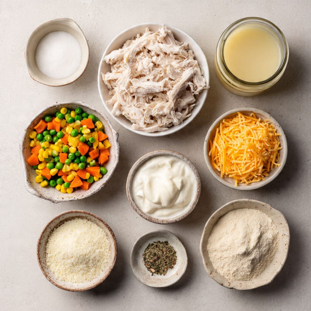 - In a large bowl, combine the chicken, frozen vegetables, cream of chicken soup, sour cream, garlic powder, onion powder, salt, pepper, and 1 cup of shredded cheddar cheese.