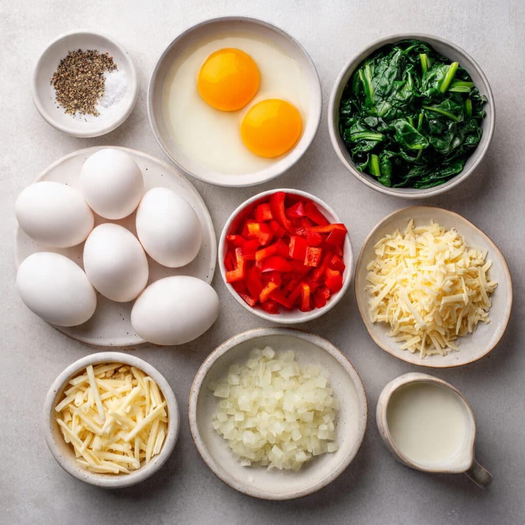 - Combine Ingredients: In a mixing bowl, whisk together eggs and milk. Stir in diced bell pepper, chopped spinach, onion, shredded cheddar, salt, and black pepper until evenly combined.