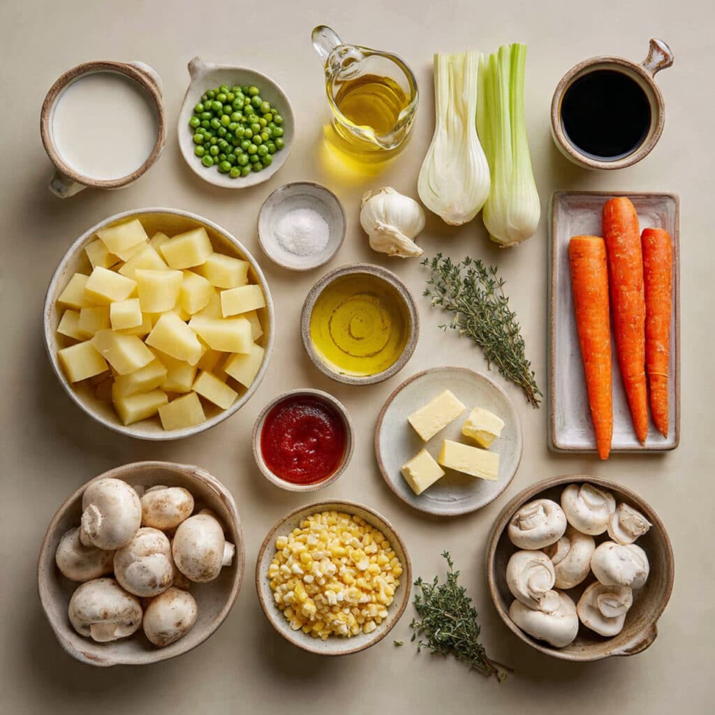 In a large skillet, heat olive oil over medium heat. Add onions, carrots, and celery. Sauté until softened, about 5–6 minutes. Stir in mushrooms and garlic, cook until mushrooms release moisture. Mix in tomato paste, thyme, soy sauce, and flour. Stir well. Pour in the vegetable broth, then add peas and corn. Simmer until thickened, about 8 minutes. Season with salt and pepper to taste. - Prepare Your Cooking Vessel: