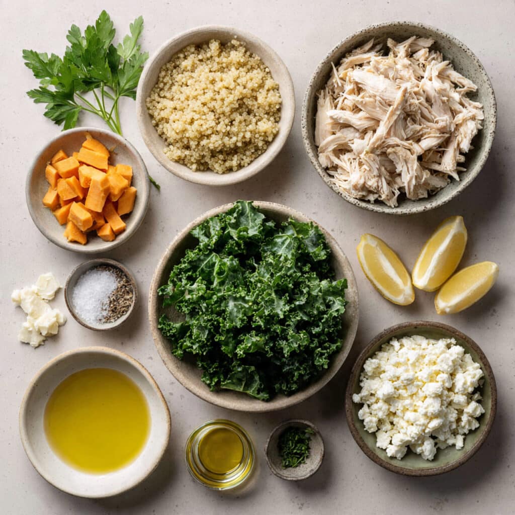 A hearty, flavorful bowl packed with shredded chicken, roasted sweet potatoes, quinoa, kale, and creamy feta. Balanced with a bright lemon finish, this dish is perfect for meal prep or a cozy dinner.