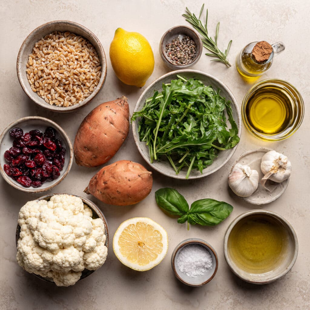 A cozy and colorful grain bowl featuring nutty farro, roasted sweet potatoes, cauliflower, peppery arugula, tangy cranberries, and a fresh basil pesto drizzle. Perfect for meal prep or a hearty, plant-based dinner.