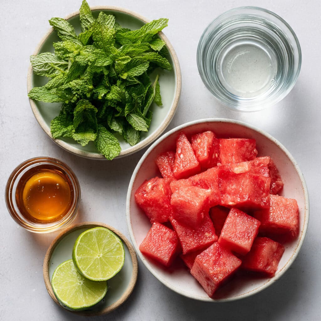 - Fresh Watermelon Cubes: 4 cups, seeds removed. This is the heart of the drink, sweet, juicy, and naturally hydrating.